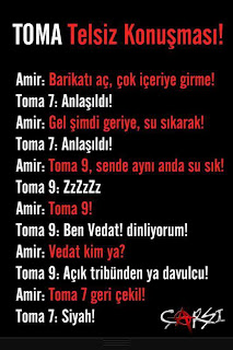 Beşiktaş FC fan group Çarşı (together with Fenerbahçe and Galatasaray fans) have been on the front lines of the clashes since the beginning of the protests. Çarşı fans even chased TOMAs (Toplumsal Olaylara Müdahele Aracı - Vehicle of Intervention in Public Events) with a bulldozer they got hold of. They eventually captured a TOMA as well, which they re-named as POMA (Polis Olaylarına Müdahele Aracı - Vehicle of Intervention in Police Events). Below is supposedly the account of the interaction with the police chief on radio when they captured the vehicle: